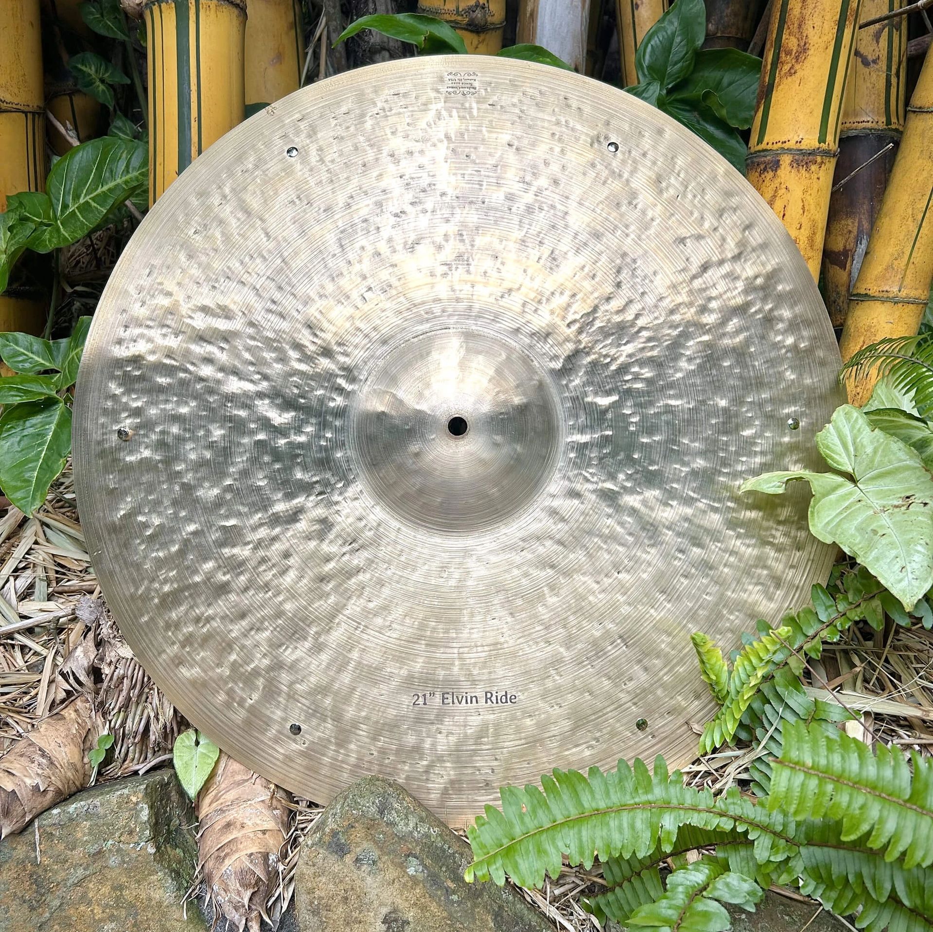 21'' Elvin jones Tribute Ride, 2372 grams with 6 rivets and a classic Patina. 100% Turkish Bronze-handmade and hand hammered in Hawaii. Has great stick definition and crash-ability! Half size rivets so its not overly heavy on natural sound of cymbal. Nice dark complex wash, but not overbearing.